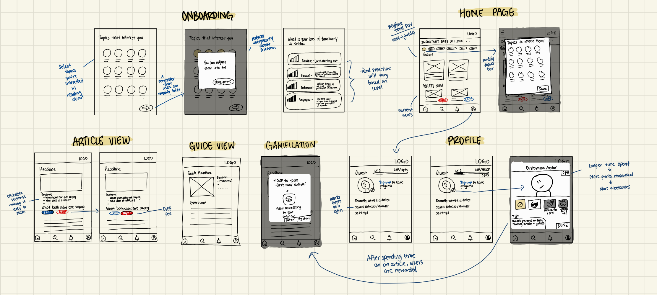 Based on the information I collected from my competitive analysis and user interviews, I created a low fidelity wireframe to consolidate and visualize my ideas.